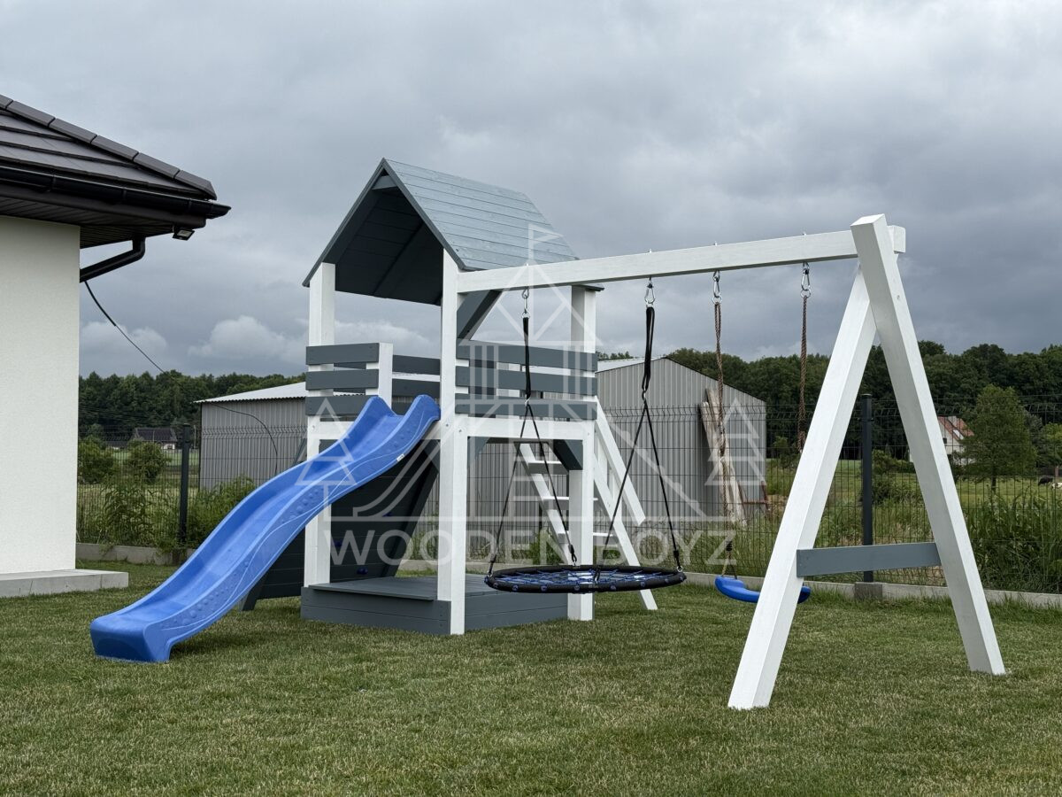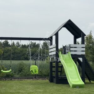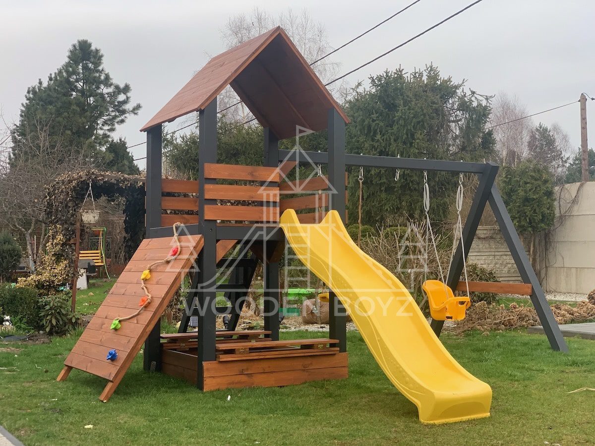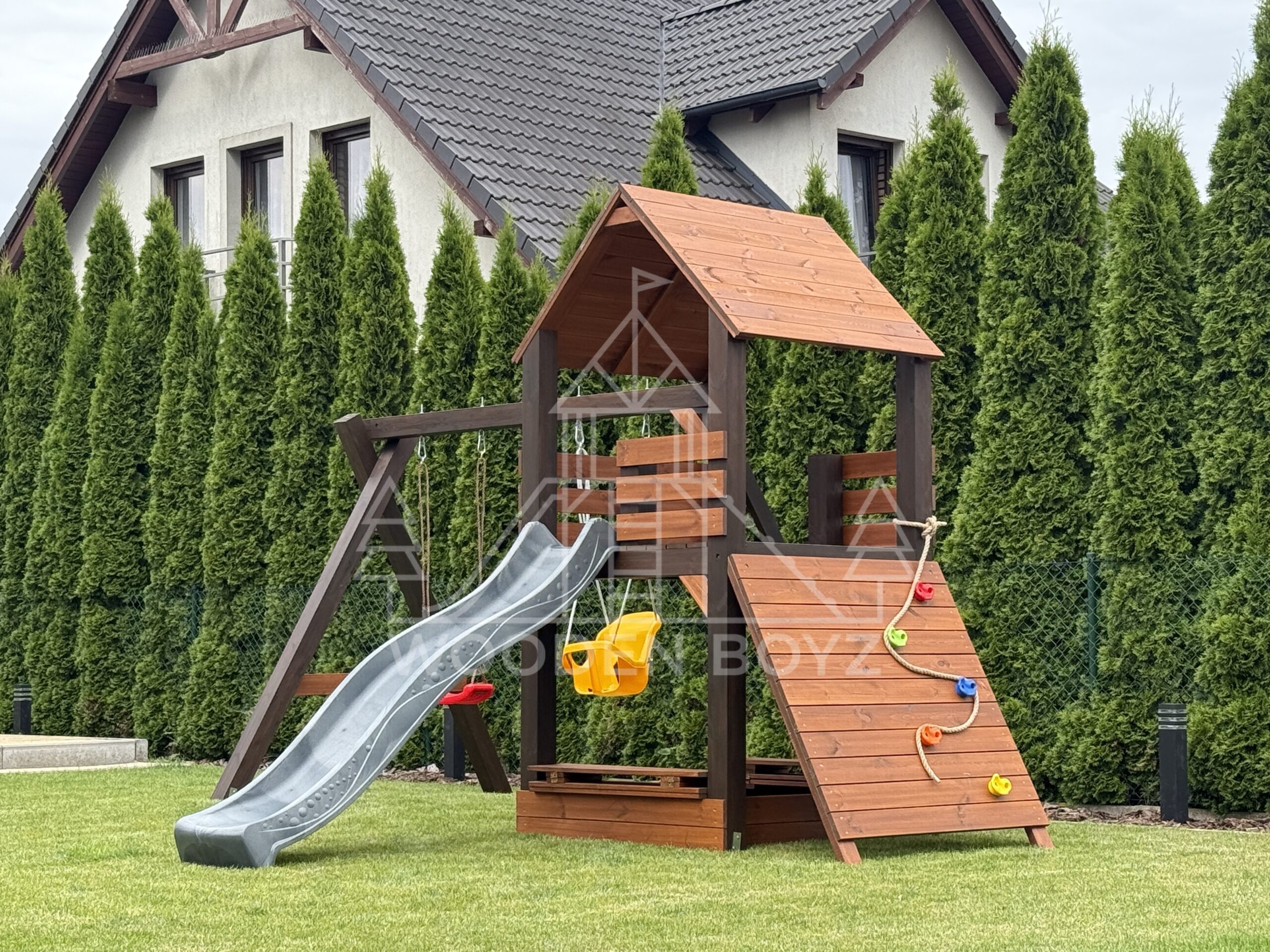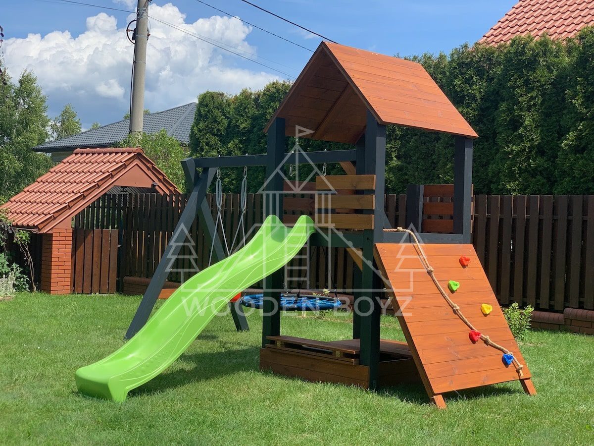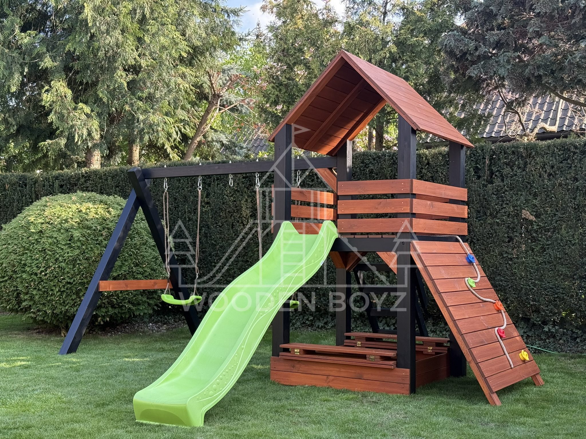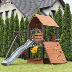 Aurelia XL ist ein einzigartiger Spielplatz, der Ihren Garten in ein Land voller Spaß und Abenteuer verwandelt. Dieses komplette Spielset vereint alles, was Ihr Kind für eine aktive Entwicklung braucht: eine aufregende Rutsche, Schaukeln für schwungvollen Spaß und einen Sandkasten, der die Kreativität fördert. Die solide Konstruktion und die durchdachte Anordnung der Elemente machen ihn zum idealen Spielplatz für Kinder unterschiedlichen Alters.