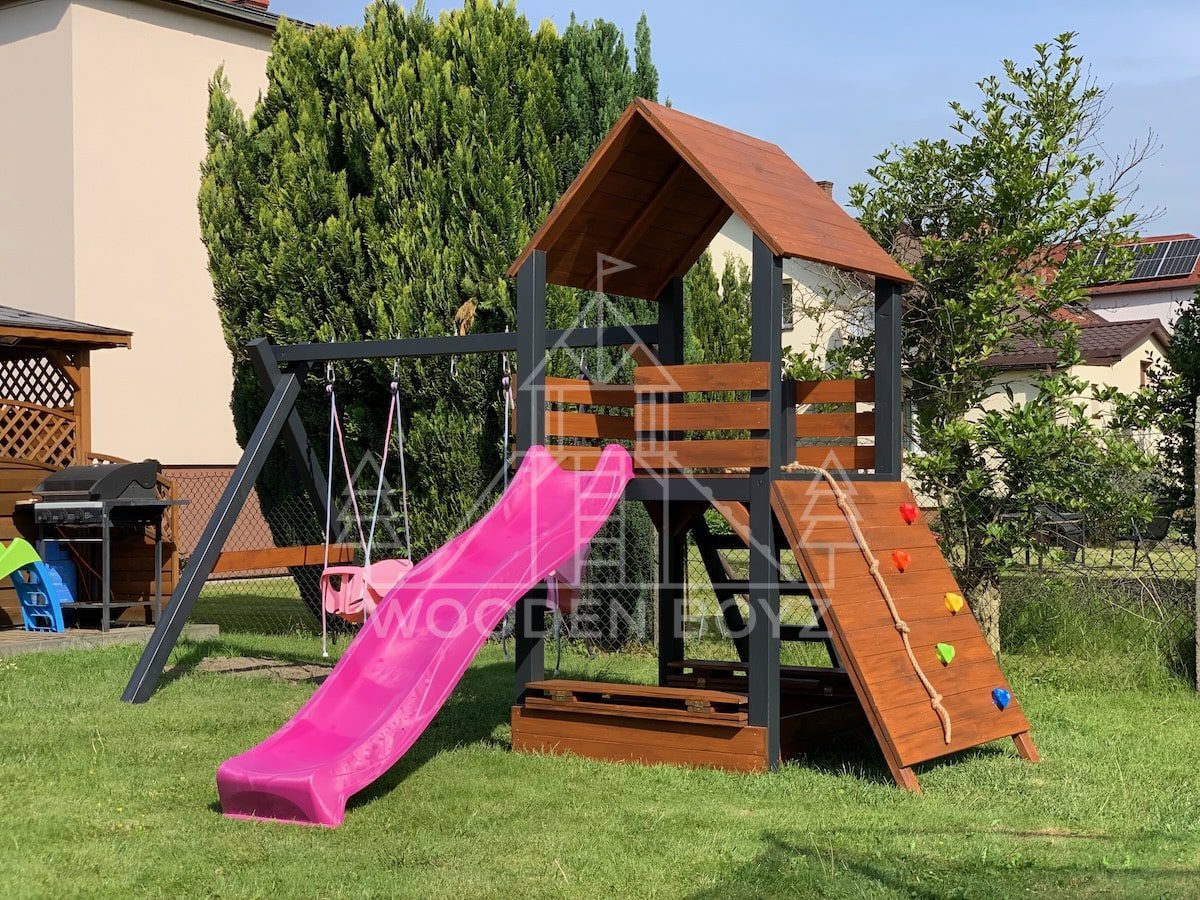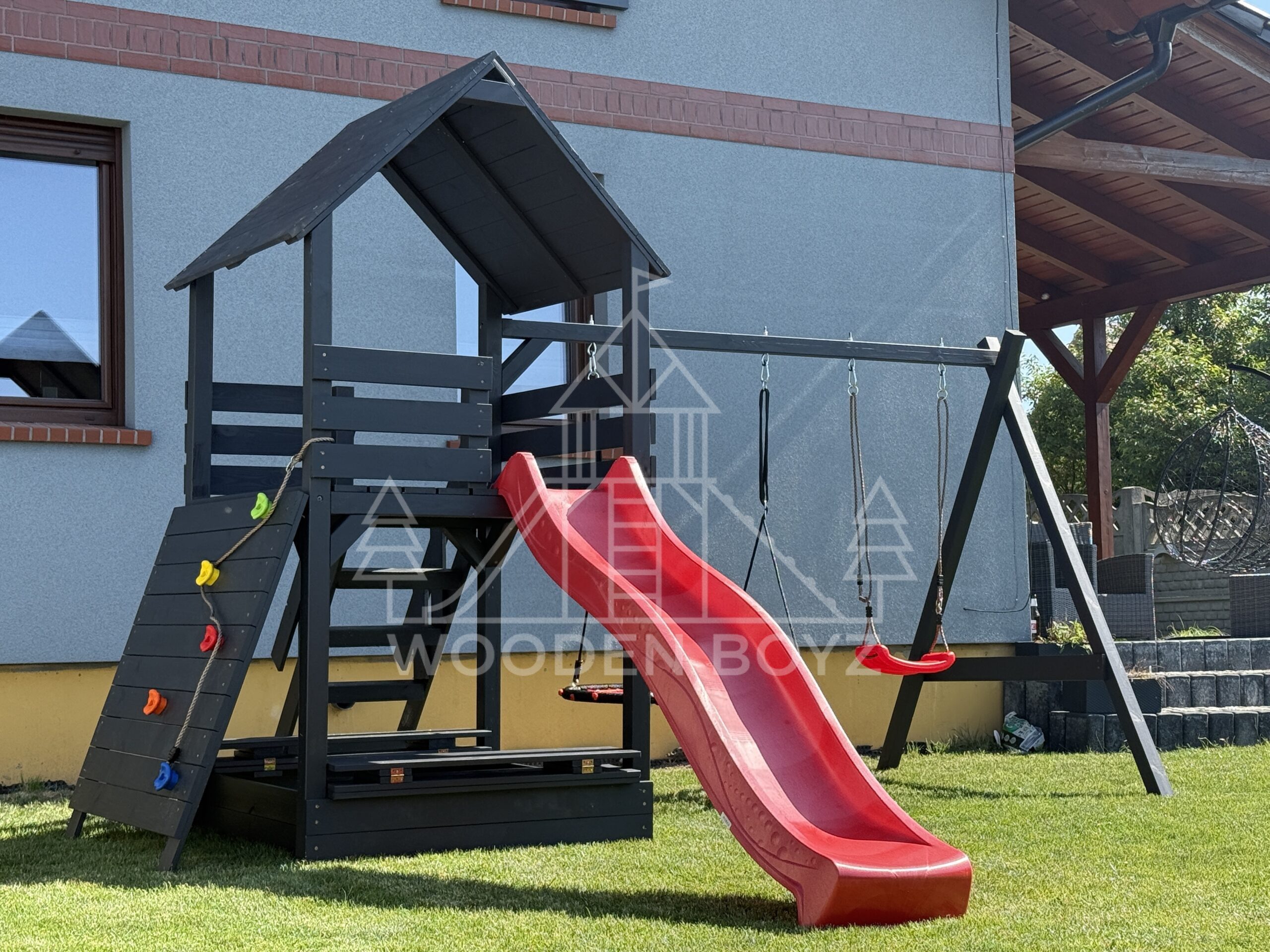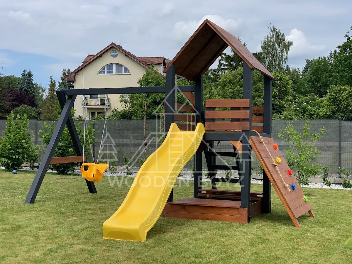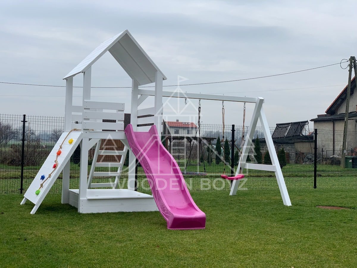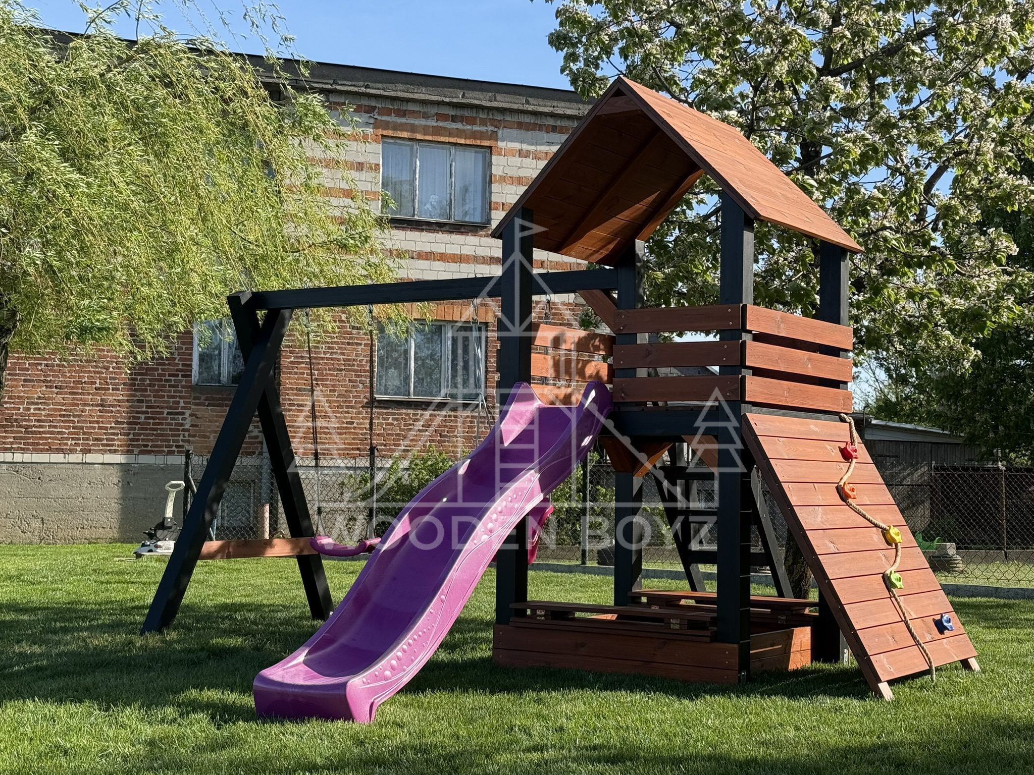Aurelia XL ist ein einzigartiger Spielplatz, der Ihren Garten in ein Land voller Spaß und Abenteuer verwandelt. Dieses komplette Spielset vereint alles, was Ihr Kind für eine aktive Entwicklung braucht: eine aufregende Rutsche, Schaukeln für schwungvollen Spaß und einen Sandkasten, der die Kreativität fördert. Die solide Konstruktion und die durchdachte Anordnung der Elemente machen ihn zum idealen Spielplatz für Kinder unterschiedlichen Alters.