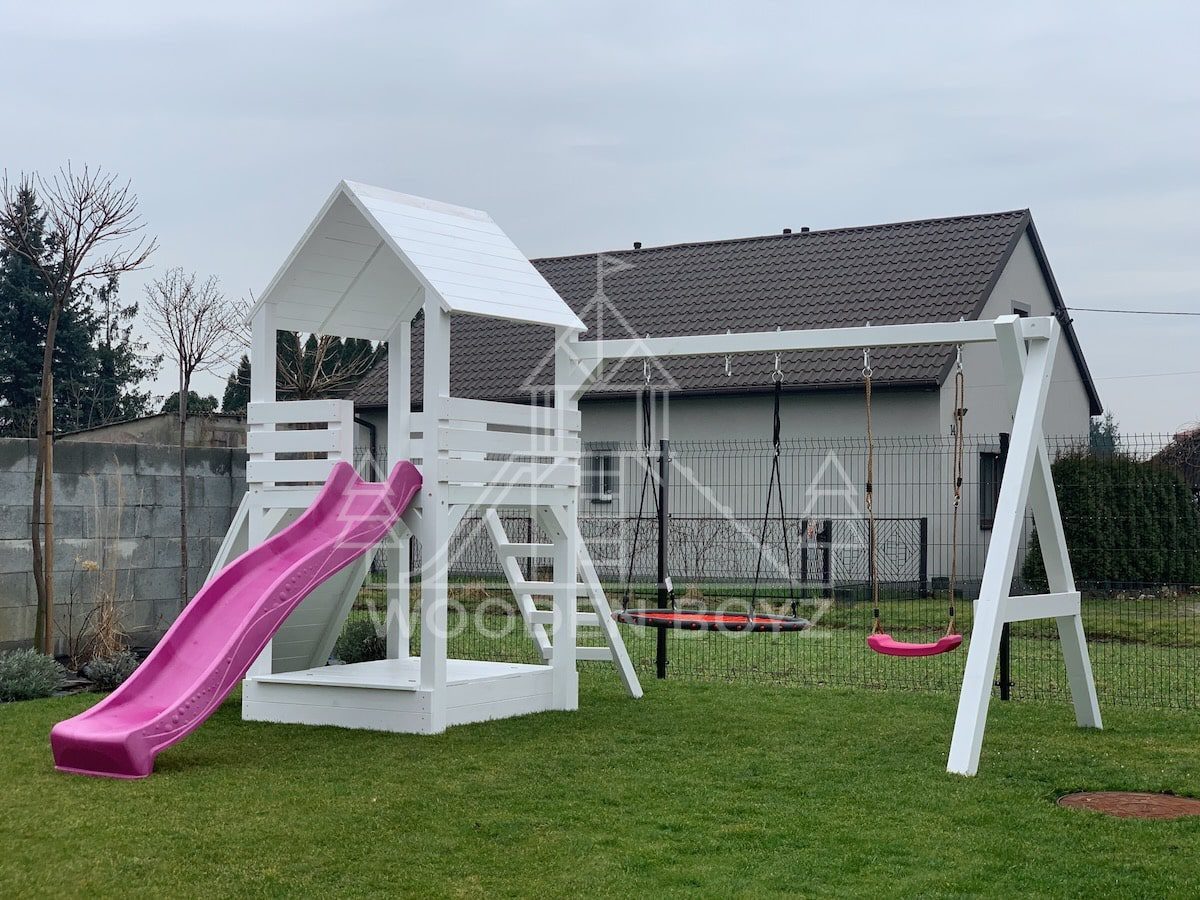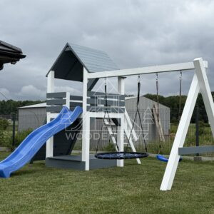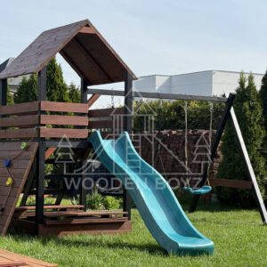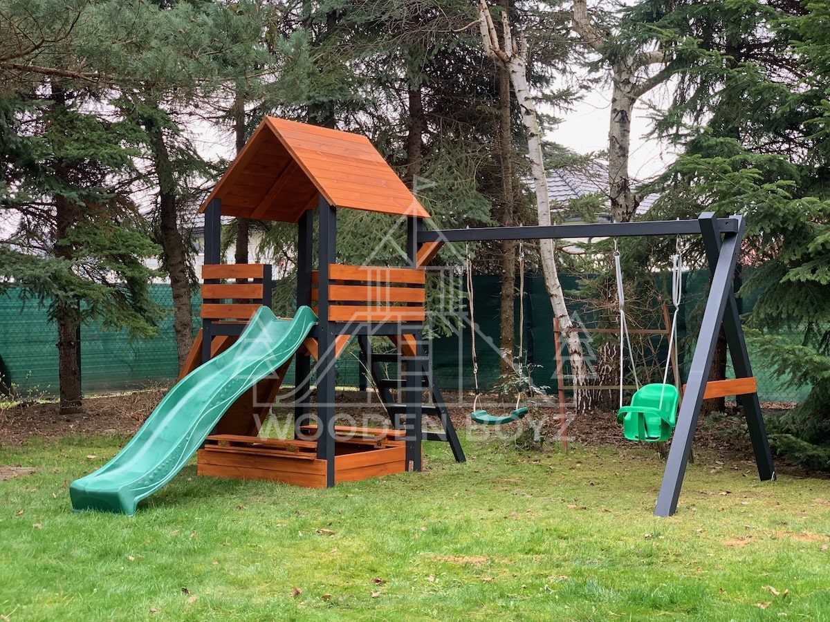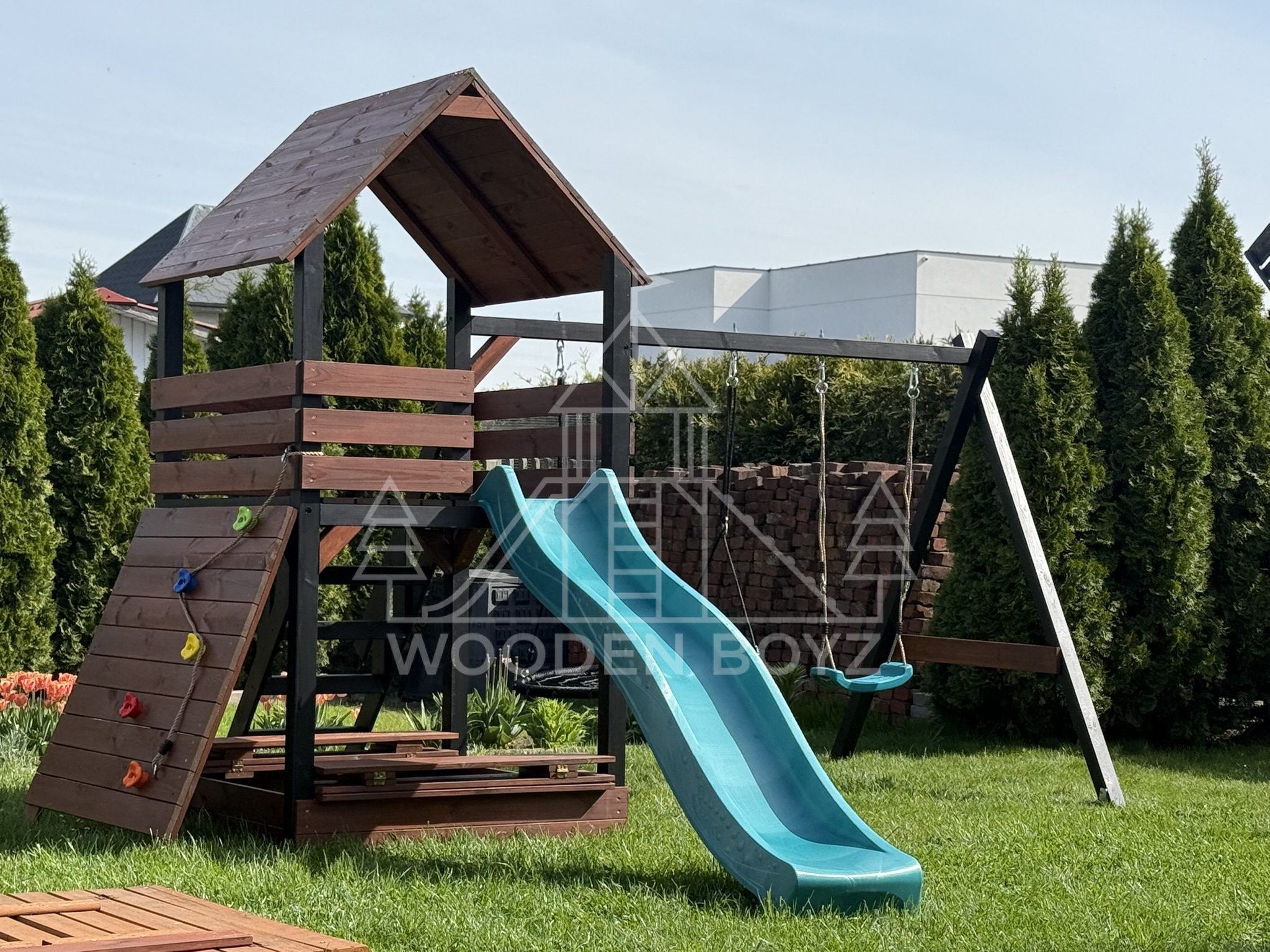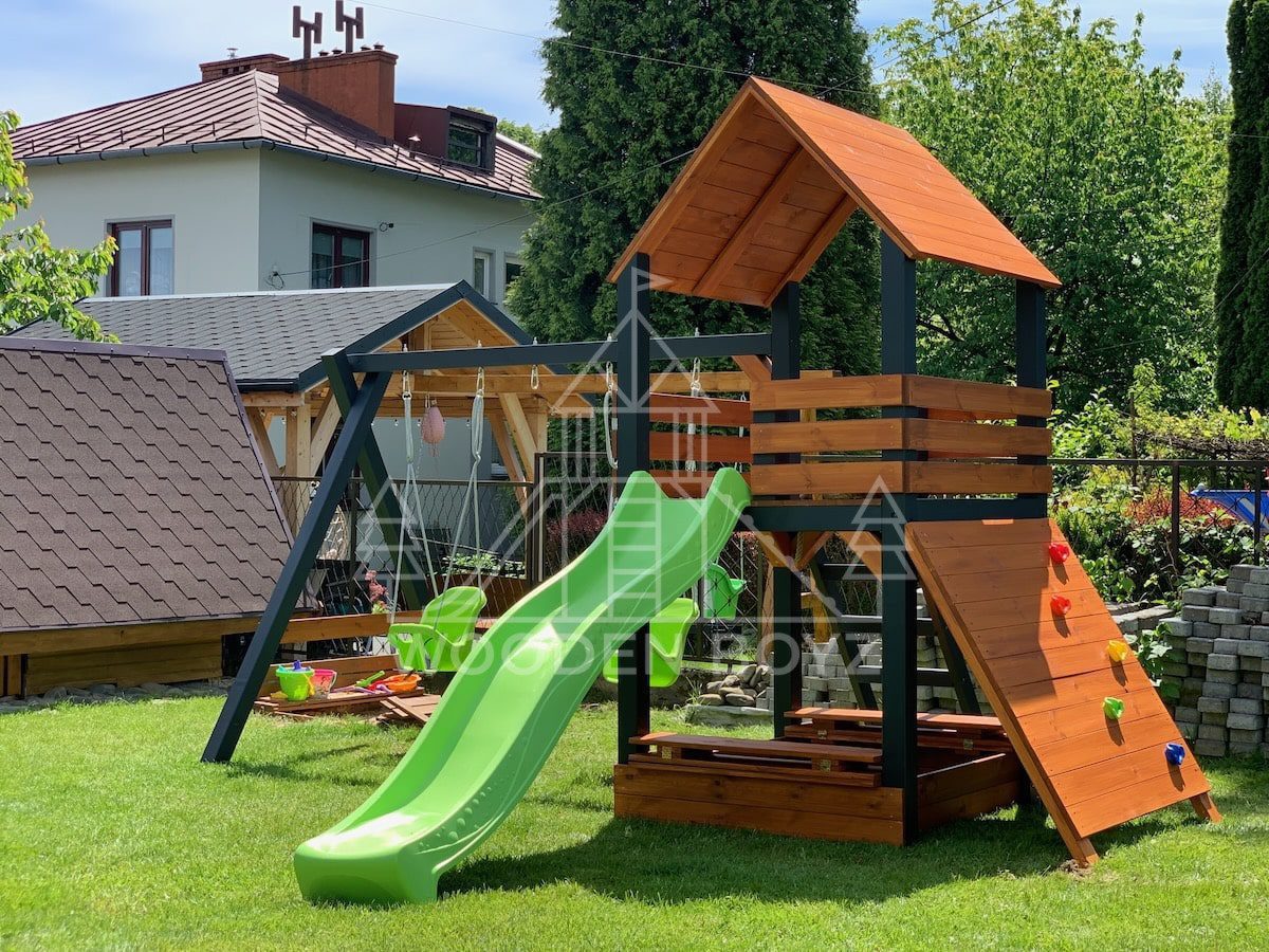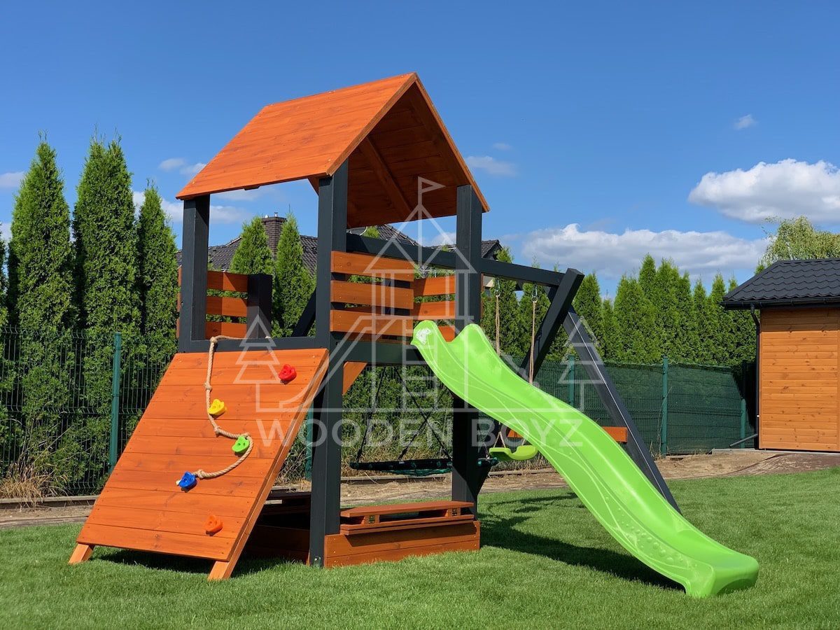 Aurelia XL ist ein einzigartiger Spielplatz, der Ihren Garten in ein Land voller Spaß und Abenteuer verwandelt. Dieses komplette Spielset vereint alles, was Ihr Kind für eine aktive Entwicklung braucht: eine aufregende Rutsche, Schaukeln für schwungvollen Spaß und einen Sandkasten, der die Kreativität fördert. Die solide Konstruktion und die durchdachte Anordnung der Elemente machen ihn zum idealen Spielplatz für Kinder unterschiedlichen Alters.