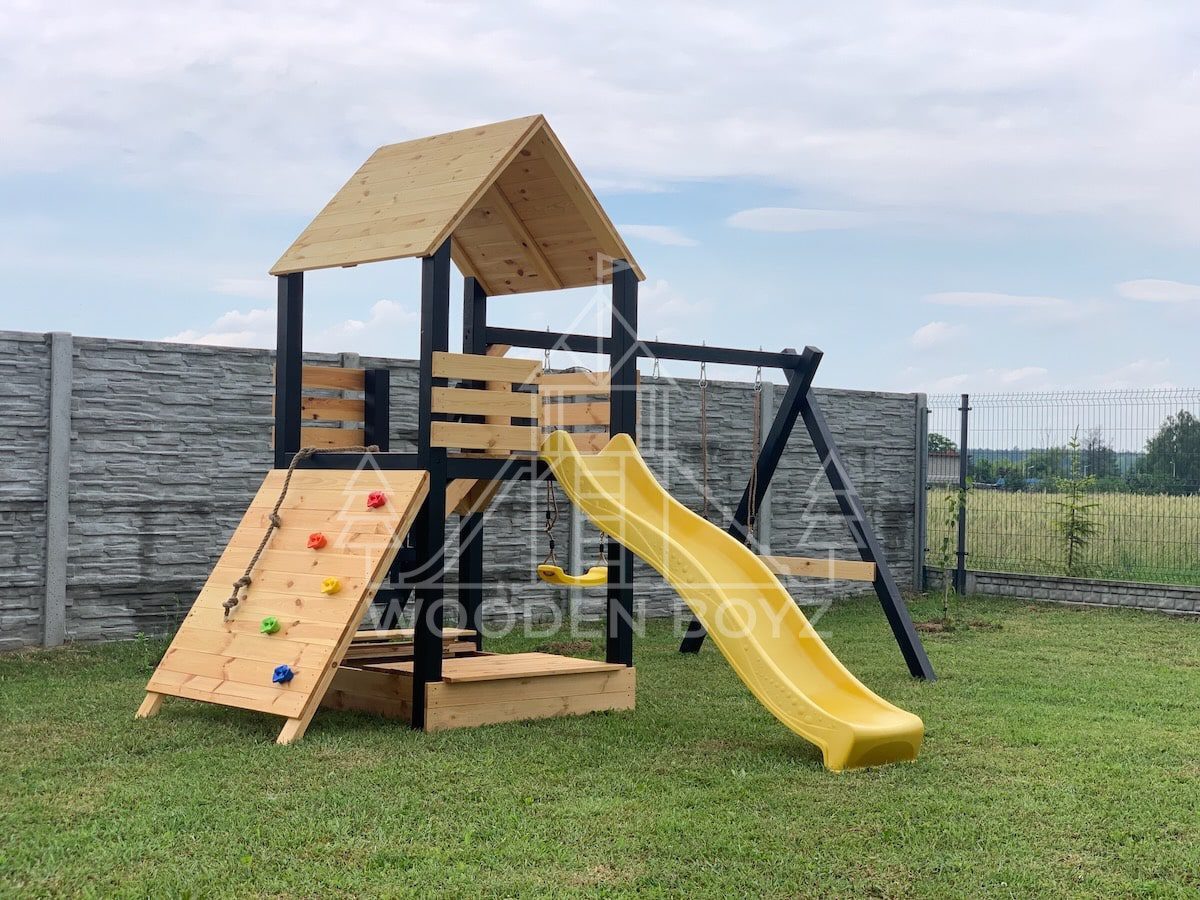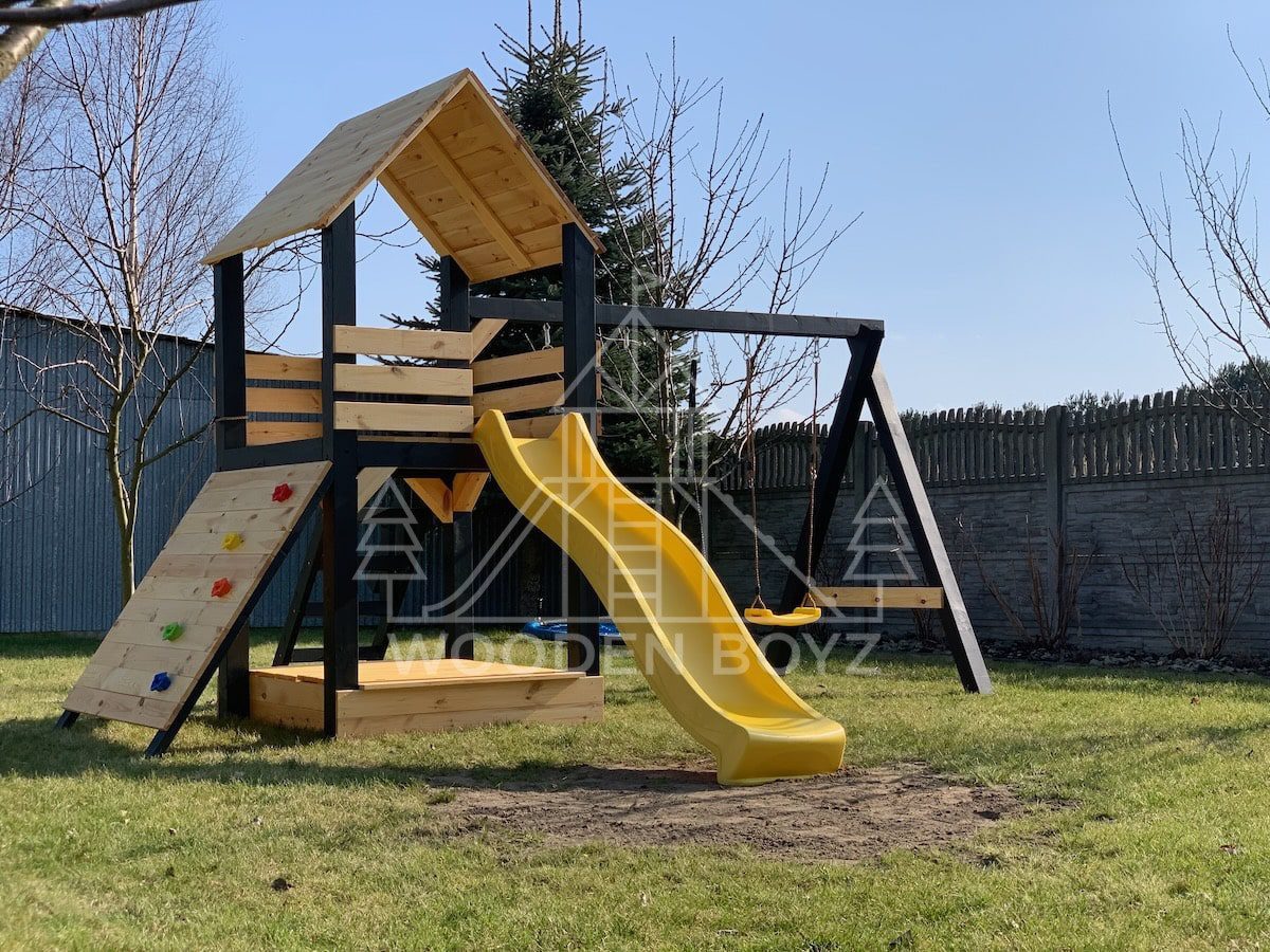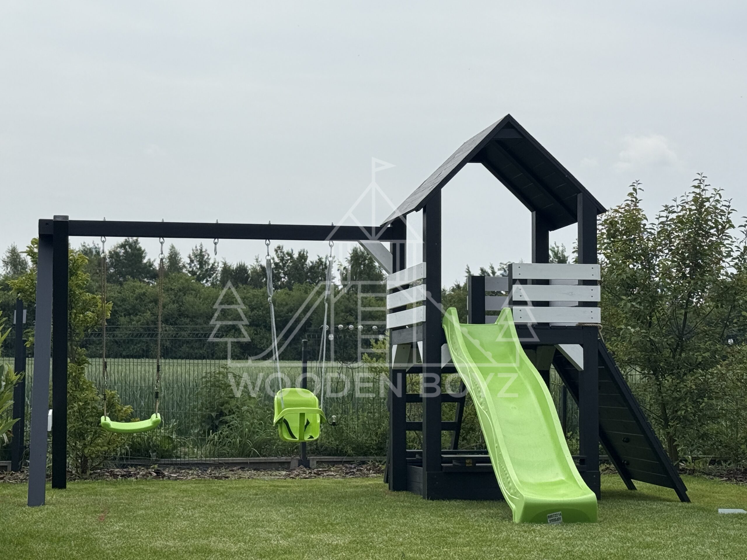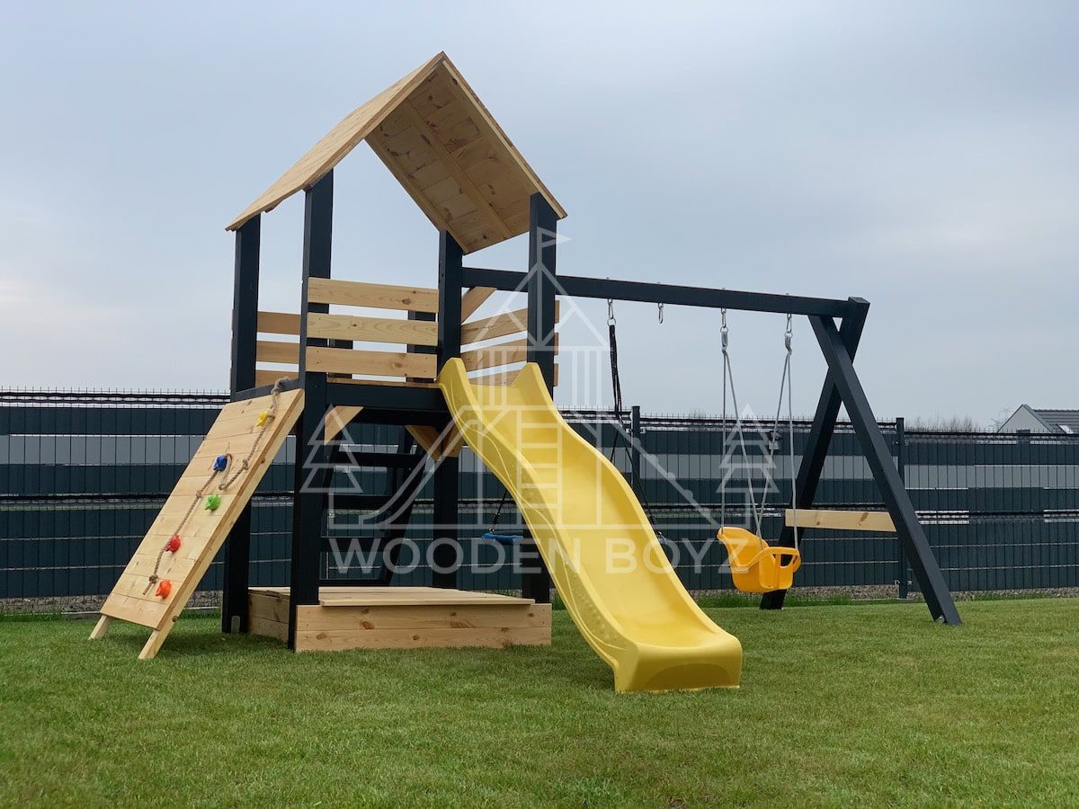 | Standardausstattung | Offener Sandkasten Turm mit Kletterwand – zwei Aufstiegsmöglichkeiten: über ein Seil und über Klettergriffe Treppe Zwei Schaukeln – wahlweise Kleinkind-Schalensitz oder Kunststoffbrett Rutsche mit 2,5 m Länge mit Möglichkeit zum Anschluss von Wasser Holzschutzmittel und Zubehör – breite Farbpalette zur Auswahl |