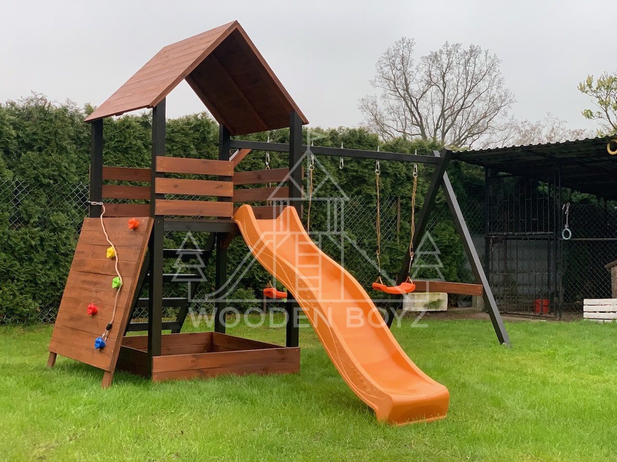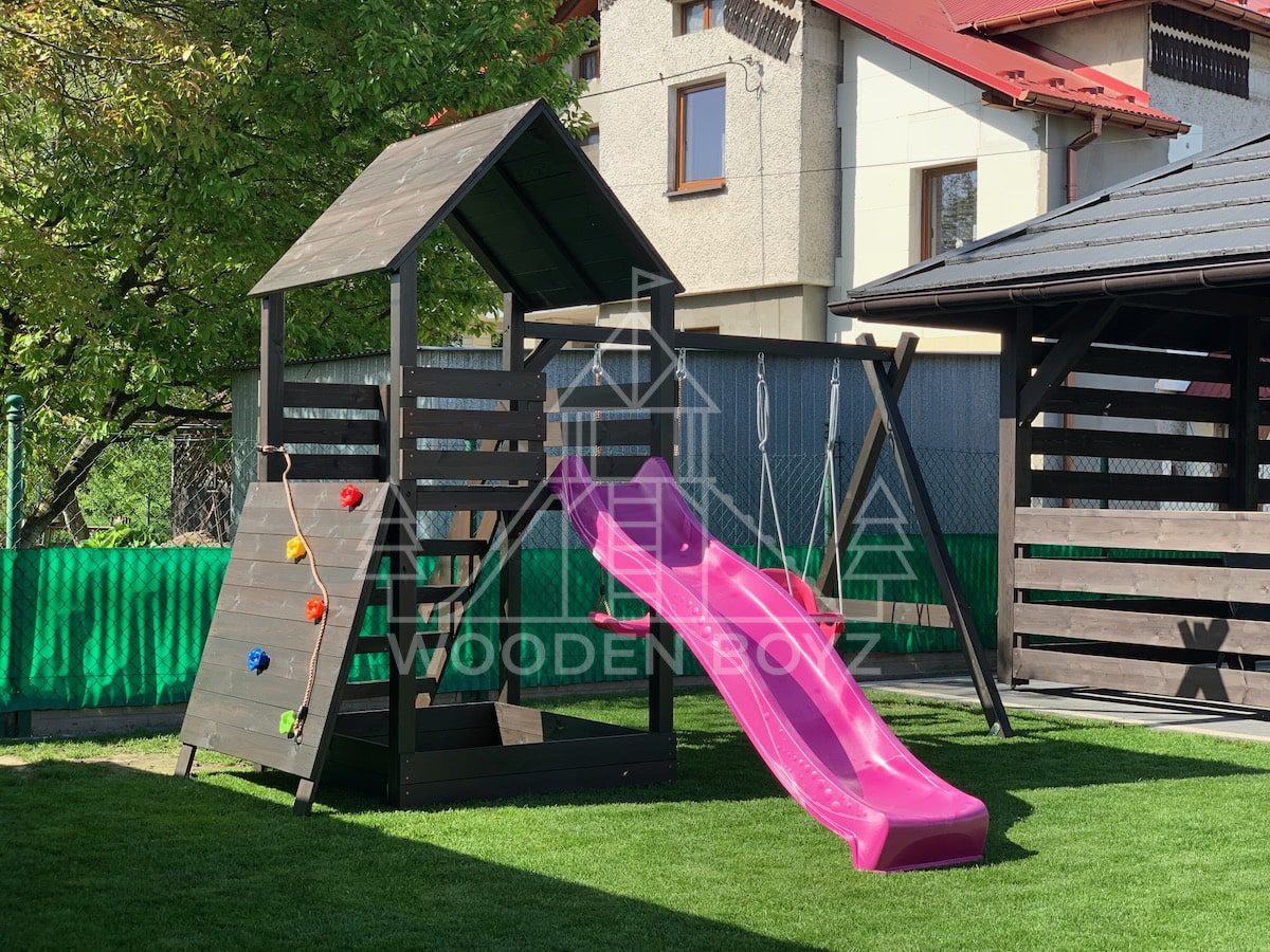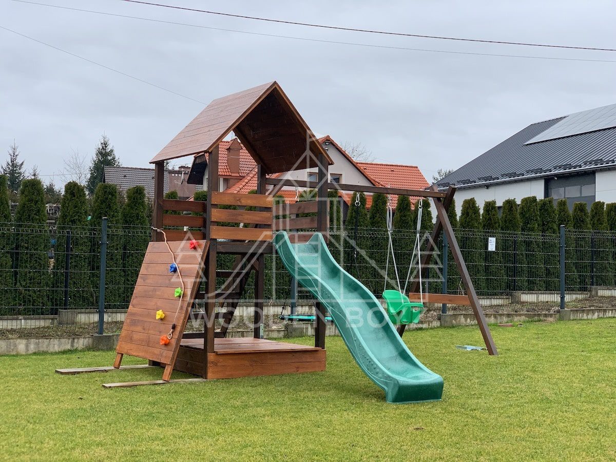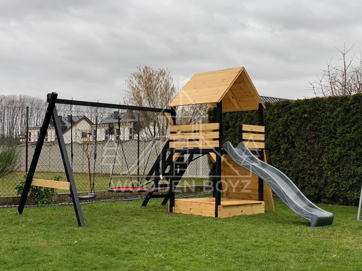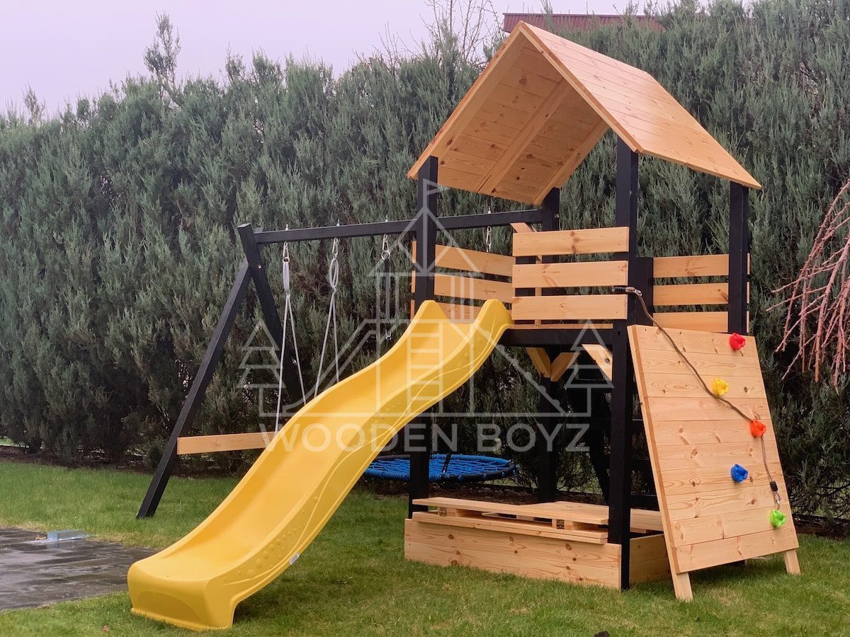 Der Spielplatz Gaja ist ein einzigartiger Ort zum Spielen und Entfalten, der fĂĽr eine unbeschwerte Kindheit geschaffen wurde. Er vereint drei Lieblingselemente jedes Kindes: Schaukeln zum unbeschwerten Schaukeln, eine sichere Rutsche und einen Sandkasten fĂĽr kreatives Spielen. Er ist aus hochwertigem, zertifiziertem C24-Kiefernholz gefertigt und der ideale Ort fĂĽr aktive Freizeitgestaltung im Freien.