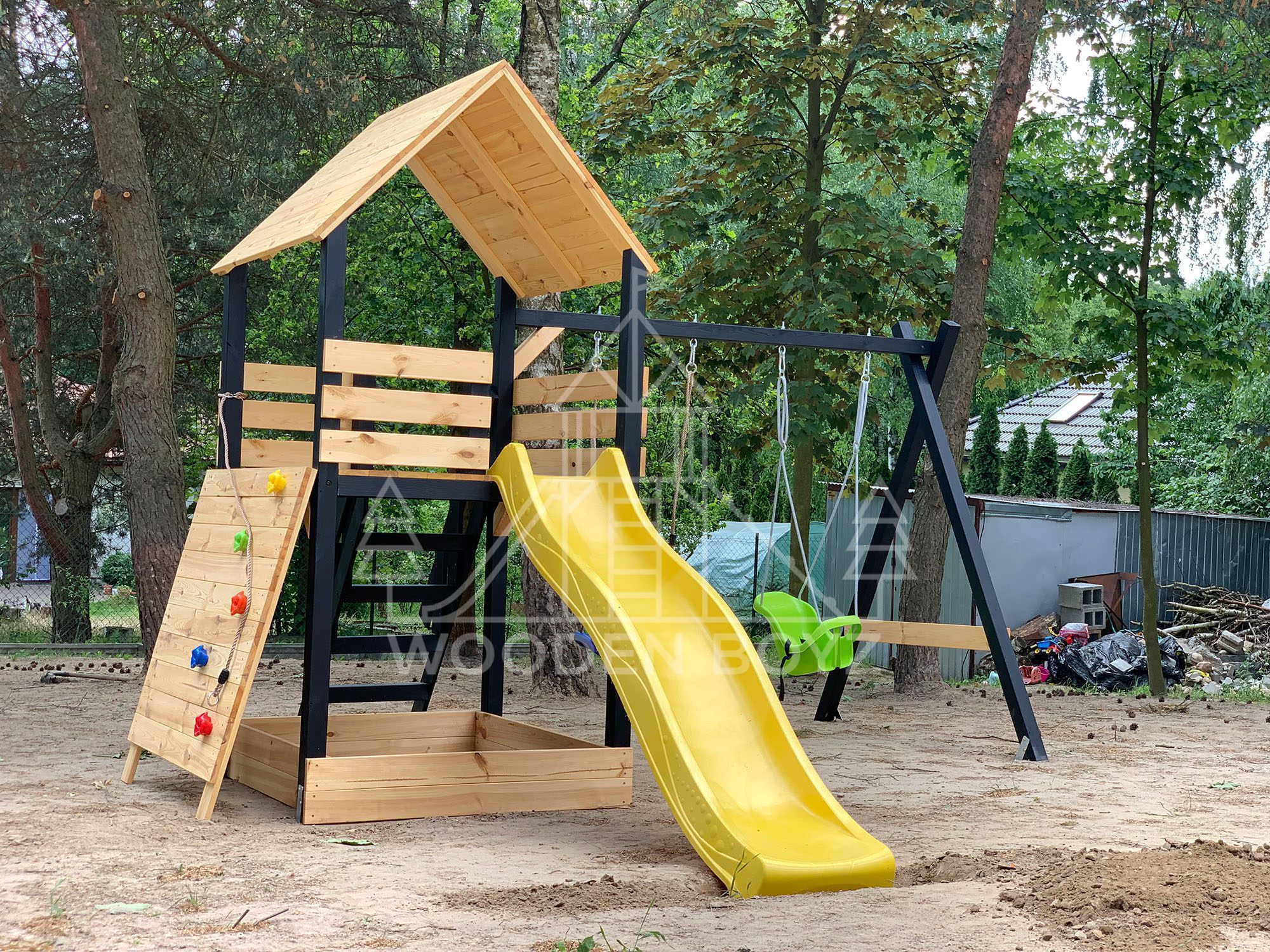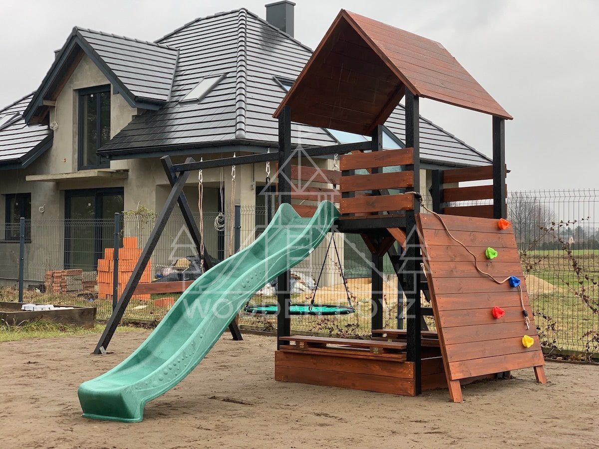Der Spielplatz Gaja ist nicht nur ein Ort zum Spielen, sondern auch ein ästhetisches Element Ihres Gartens. Dank des natürlichen Holzes und der sorgfältigen Verarbeitung fügt er sich perfekt in die Umgebung ein. Die praktische Abdeckung des Sandkastens schützt den Sand vor Regen und ungebetenen Gästen (Zusatzoption), und die durchdachte Konstruktion sorgt für eine einfache Reinigung.