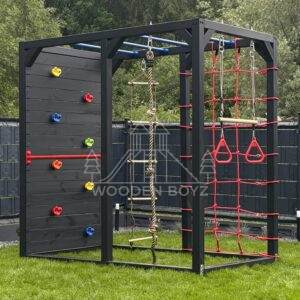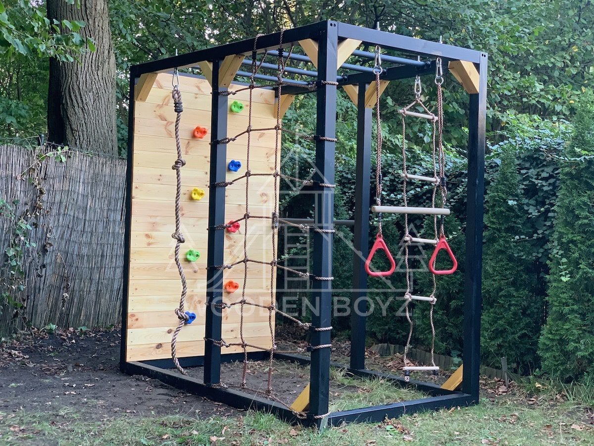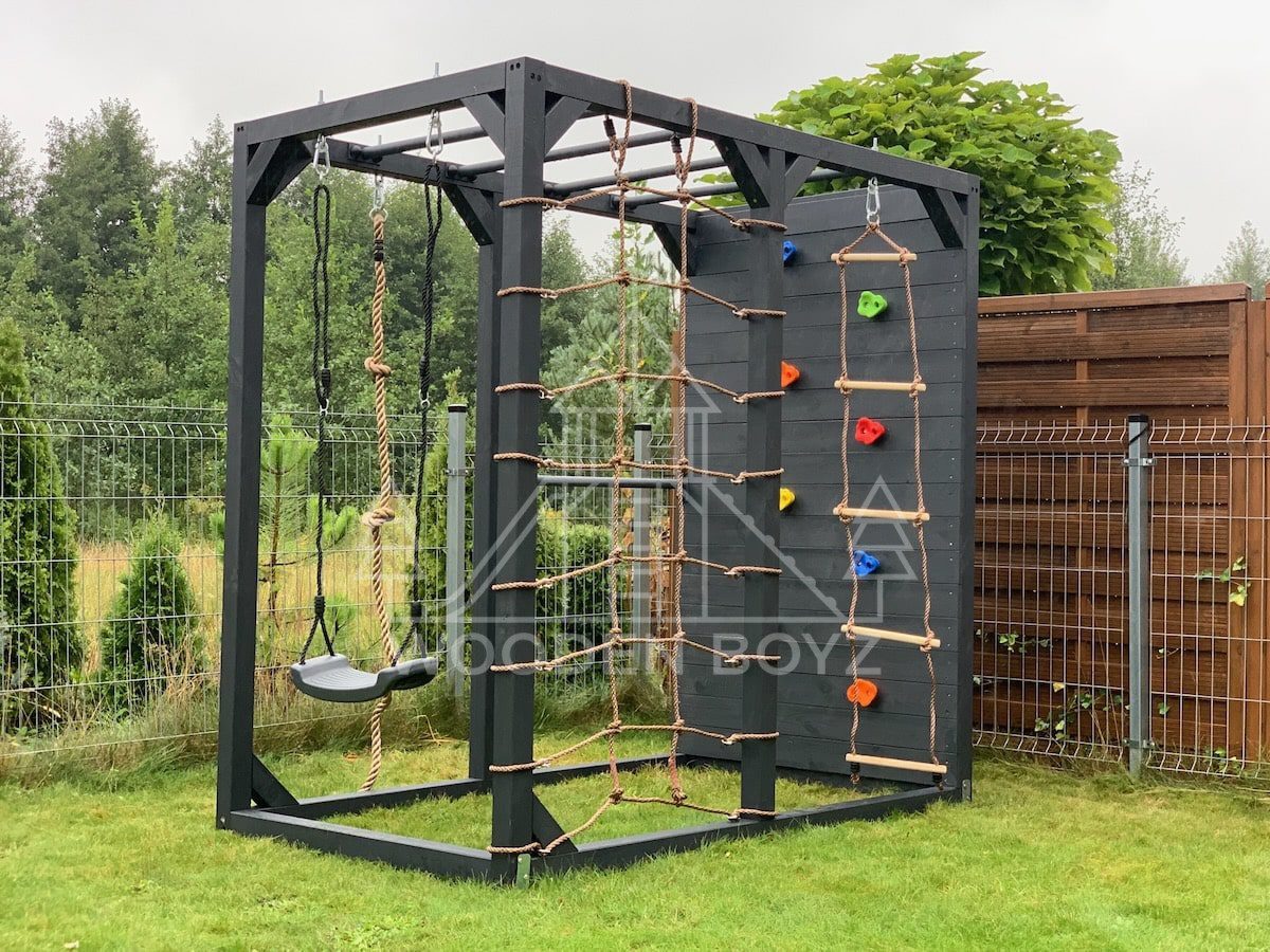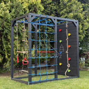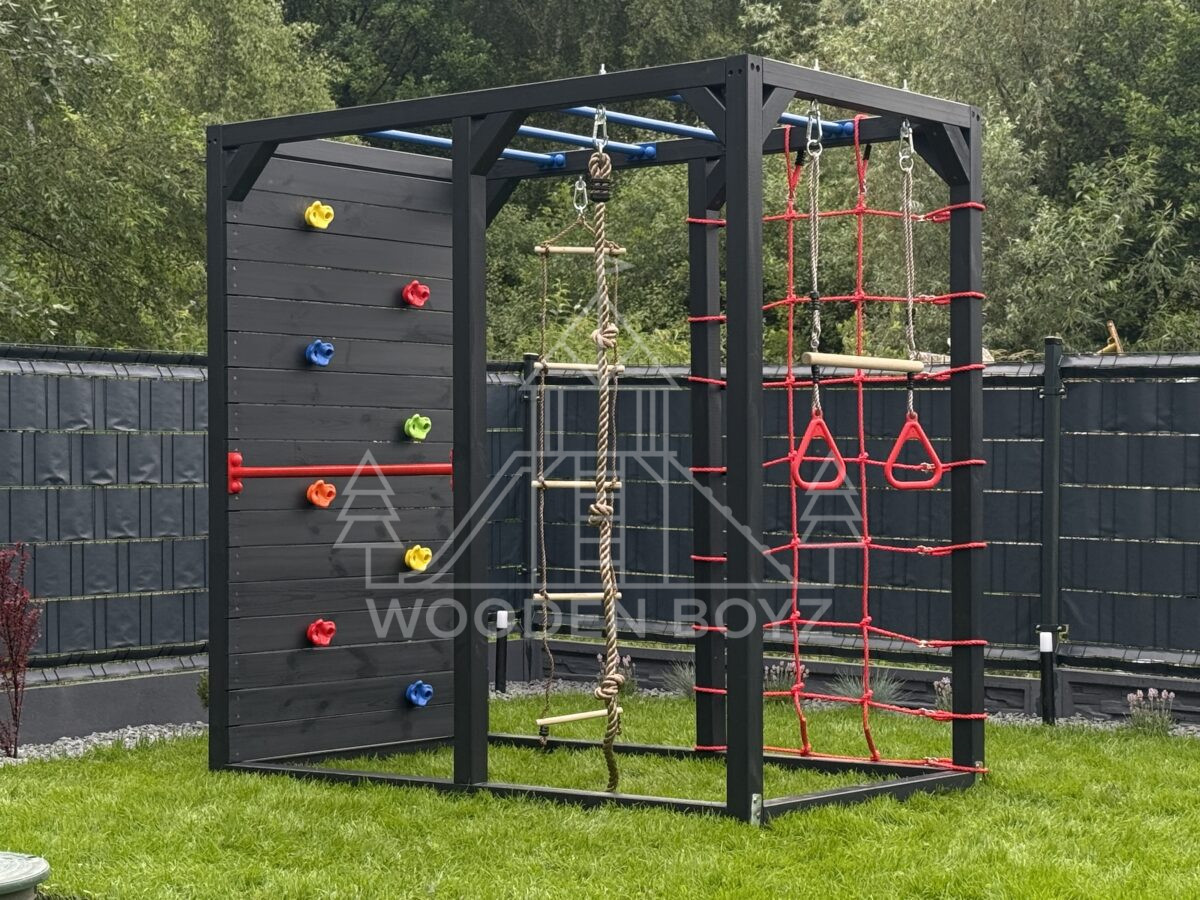 | Standardausstattung | Stangen im oberen Bereich der Konstruktion – ideal zum Klettern und für Akrobatik Kletternetz Akrobatikstange in 1 Meter Höhe Hohe Kletterwand Kletterseil mit Knoten Bewegliche Strickleiter Schaukel (zur Auswahl: Trapez, Schaukelsitz, Kleinkind-Schalensitz oder Brett) 4 Bodenanker zum Einschlagen – für maximale Stabilität Holzschutzmittel und Zubehör – breite Farbpalette zur Auswahl |