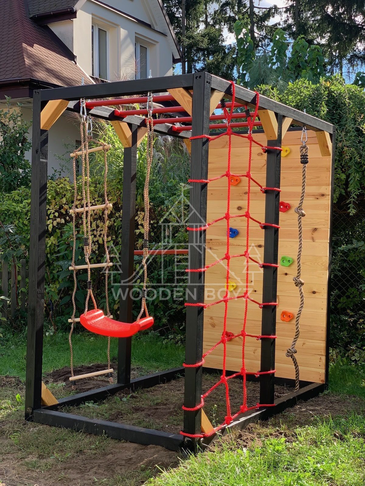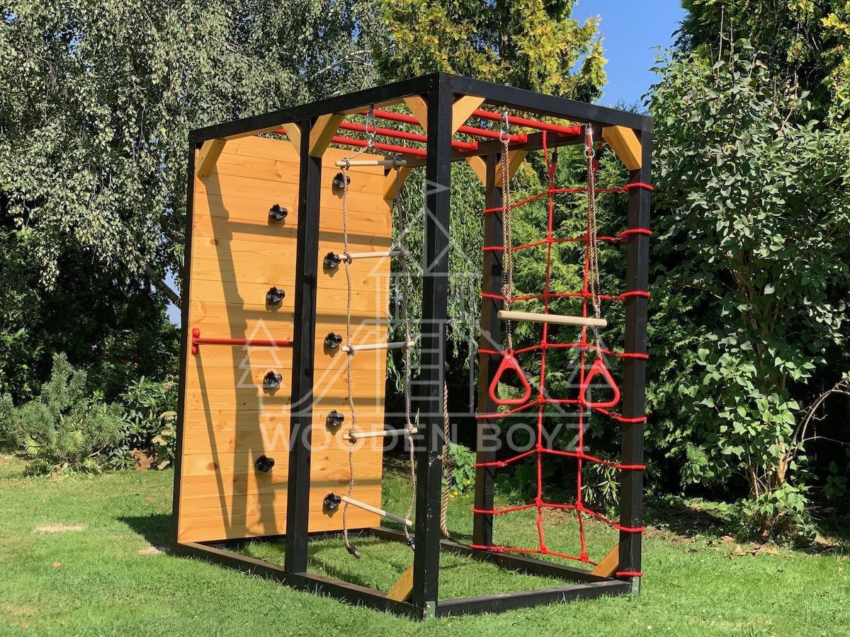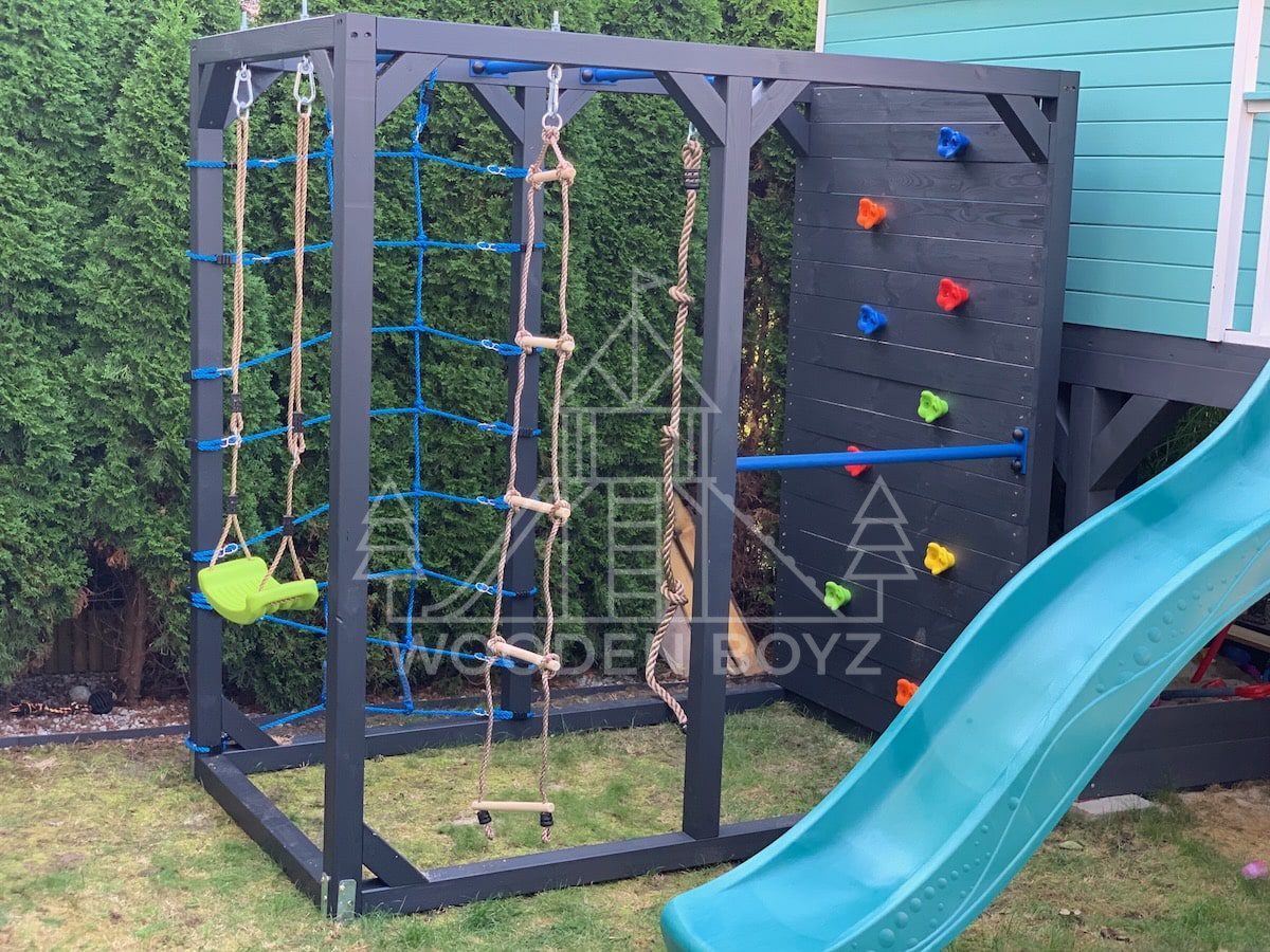 | Standardausstattung | Stangen im oberen Bereich der Konstruktion – ideal zum Klettern und für Akrobatik Kletternetz Akrobatikstange in 1 Meter Höhe Hohe Kletterwand Kletterseil mit Knoten Bewegliche Strickleiter Schaukel (zur Auswahl: Trapez, Schaukelsitz, Kleinkind-Schalensitz oder Brett) 4 Bodenanker zum Einschlagen – für maximale Stabilität Holzschutzmittel und Zubehör – breite Farbpalette zur Auswahl |