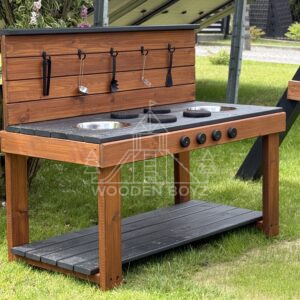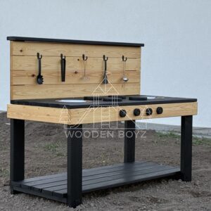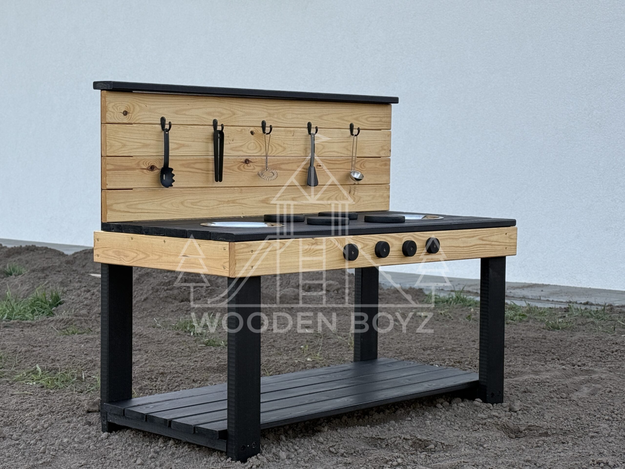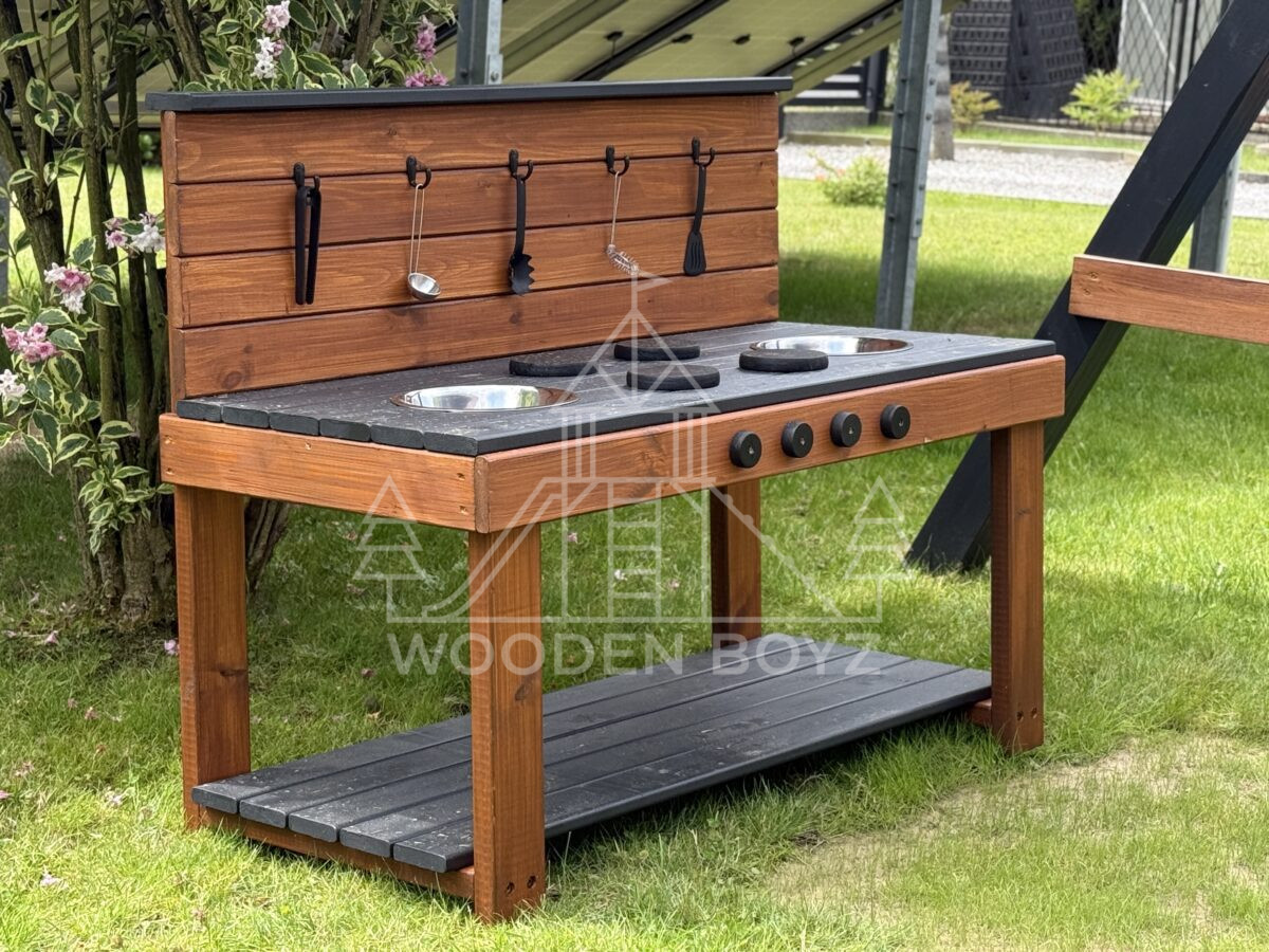 Wir präsentieren unsere Matschküche in den einzigartigen Farben Anthrazit und Gold-Eiche! Sie ist eine fantastische Ergänzung für den Kinderspielplatz – die Kleinen werden die Matsch-Experimente und das Spielen als kleine Köche lieben, und Sie erhalten eine zusätzliche Attraktion in Ihrem Garten.