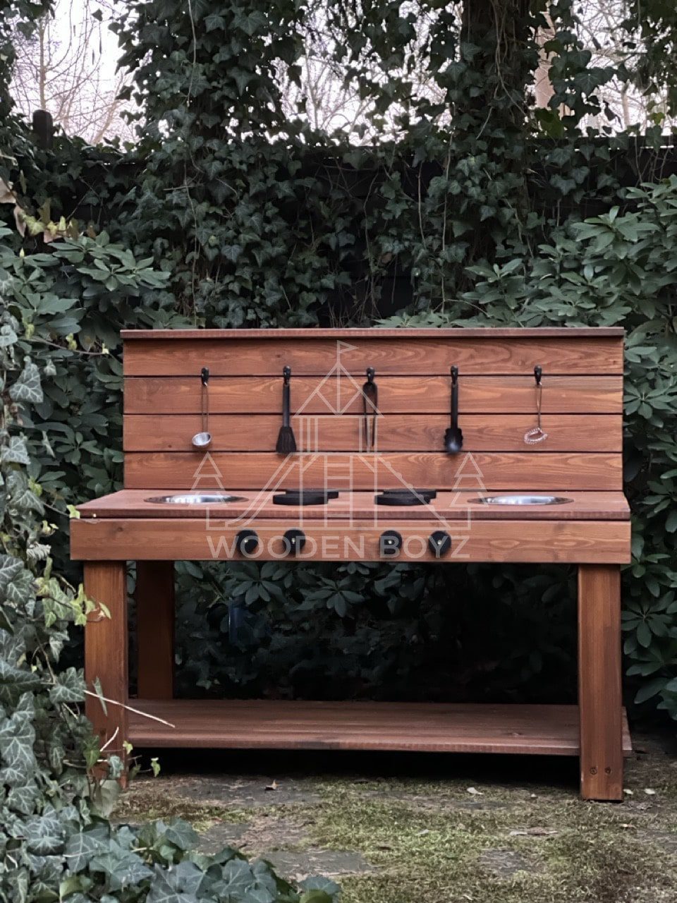 Die Matschküche besteht aus zertifiziertem Kiefernholz C24 und ist zweifach mit sicheren, wasserbasierten Mitteln imprägniert.
