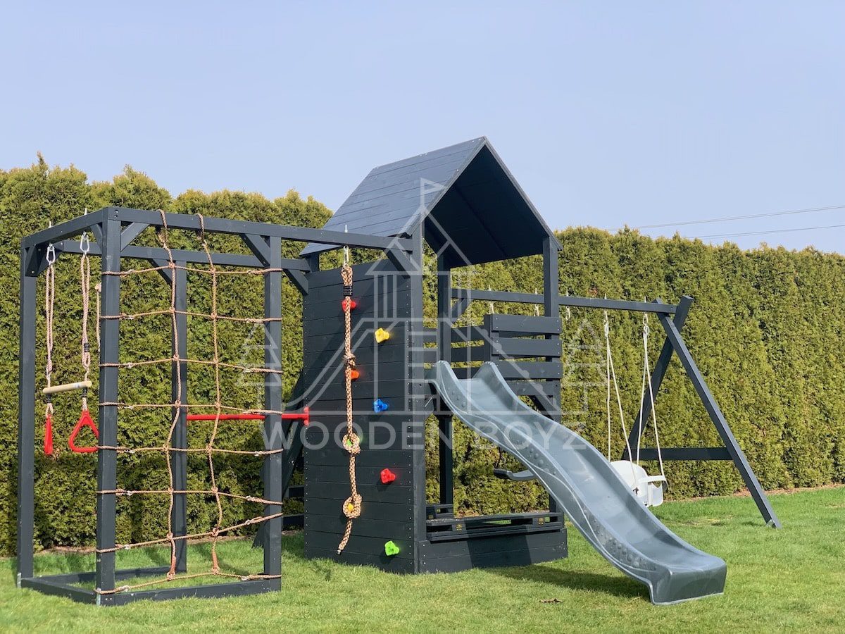 Enthalten sind Sandkasten, Turm mit Kletterwand, Treppe, Rutsche, Kletternetz, Reckstange, Seil, Leiter sowie eine Schaukel nach Wahl.